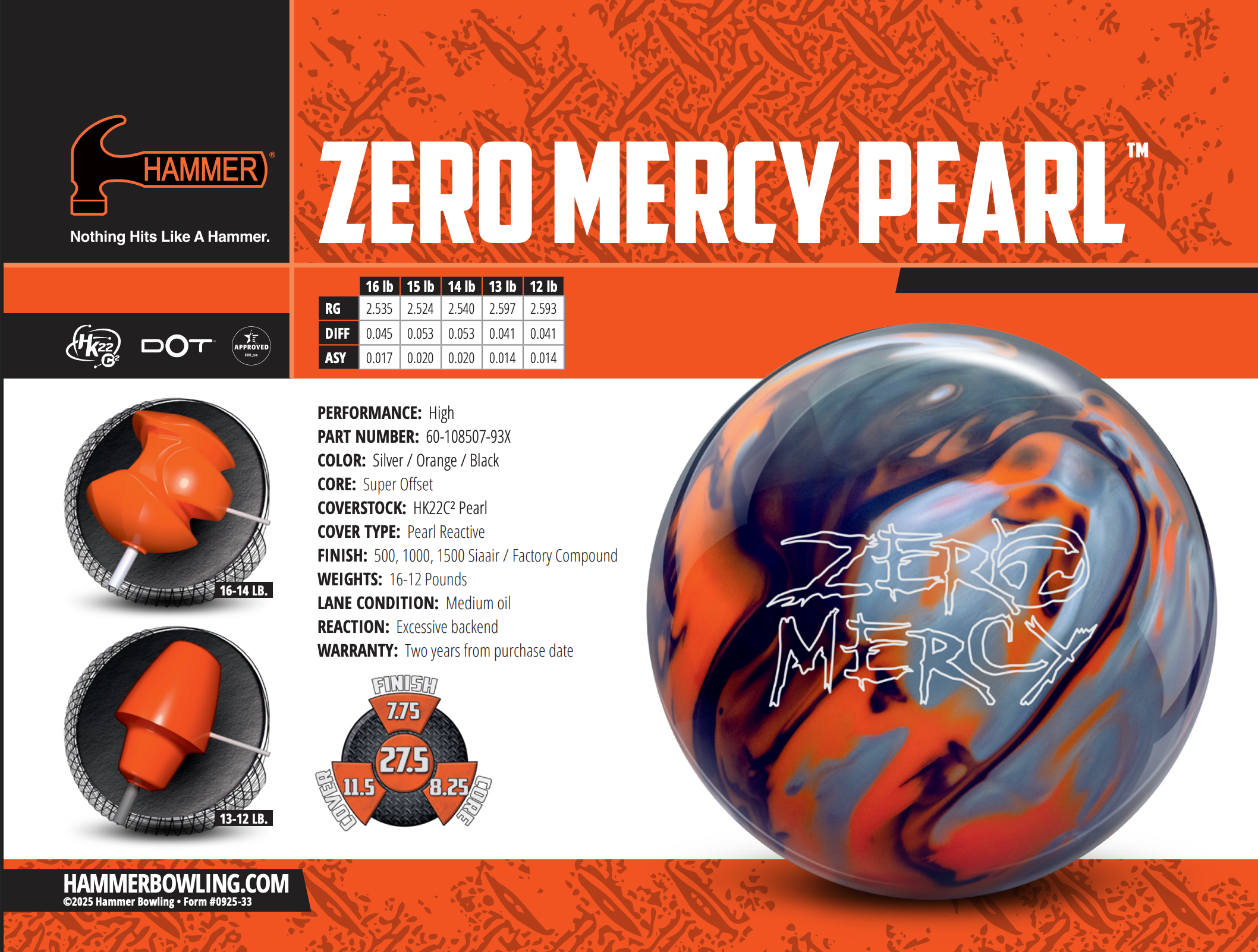 When the lanes call for length and a violent backend, the Zero Mercy Pearl answers with authority. Designed to complement the Solid perfectly, the Pearl utilizes the same aggressive Super Offset core, paired with a cleaner, faster-reacting version of the all-new HK22C² coverstock. The result is everything you’d expect from a high-performance shiny asymmetric ball—easy length, a sharp change of direction, and explosive continuation through the pins. Poured in classic Hammer colors and loaded with attitude, the Zero Mercy Pearl delivers no apologies and no forgiveness.